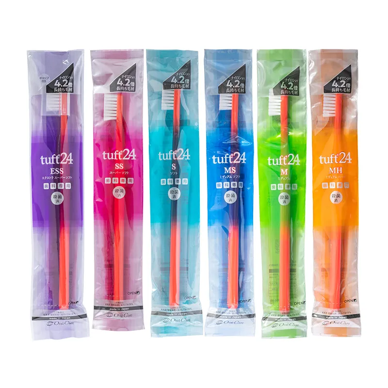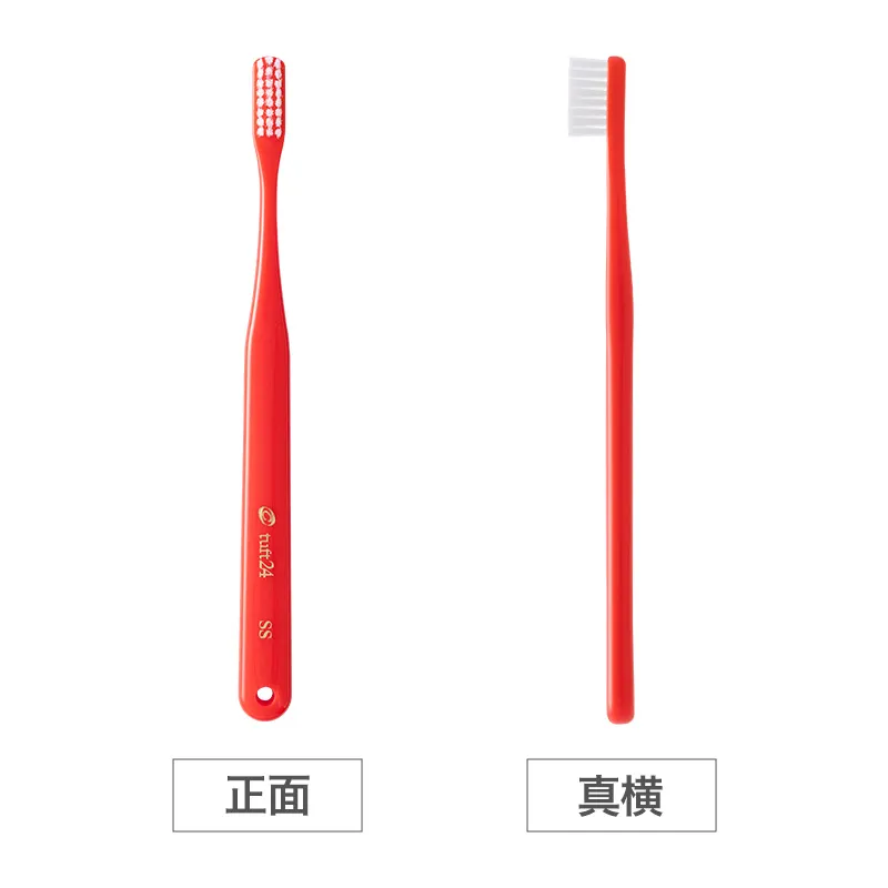 理想のプラークコントロールを実現するためのベースアイテム。奥歯の奥まで届く、コンパクトヘッドの歯ブラシです。 口腔ケアにおいて大切なのは、口腔内を傷つけることなくプラークを除去すること。『タフト24』の魅力は「狙ったプラークをしっかりかき出すコシ」と「歯や歯肉を傷つけない毛先の加工」、そして「患者さんの口腔内に合わせて選べる6種類のかたさ」にあります。 ※ESSは、タフト24キャップ付きのページをご覧ください。