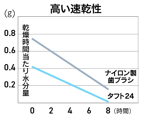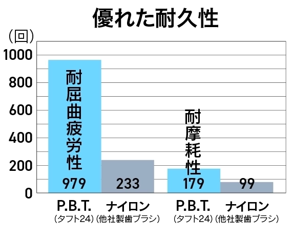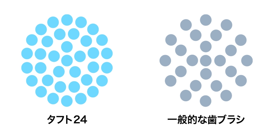 歯の汚れをきちんと落とすには、歯ブラシの毛先がしなってもとに戻る力(=コシ)が必要です。その力は水分を含むことでだんだん弱くなりますが、タフト24は別! 水はけのよい特別なPBT素材を使っているので、より強いコシをキープできます。衛生的にも◎です。