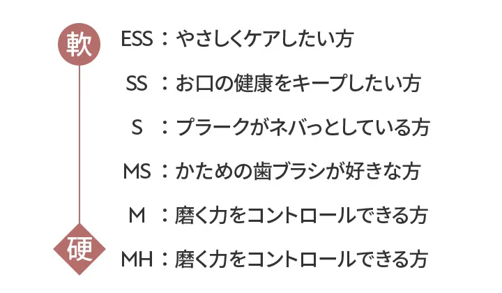 歯ぐきの腫れやプラークの性状、つき具合など。口腔内状況とブラッシング圧によって、一人ひとり適した歯ブラシのかたさは異なります。ESS(キャップ付きのみ)、SS、S、MS、M、MHから、その人の“今”にベストな歯ブラシを選べるのもタフト24の大きな魅力です。