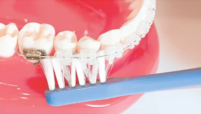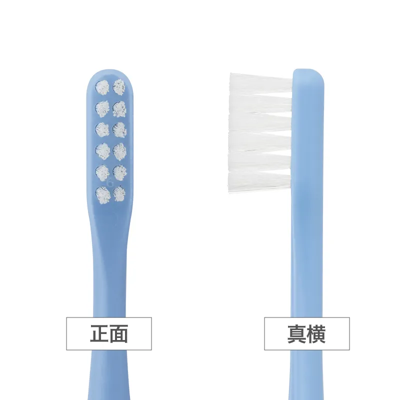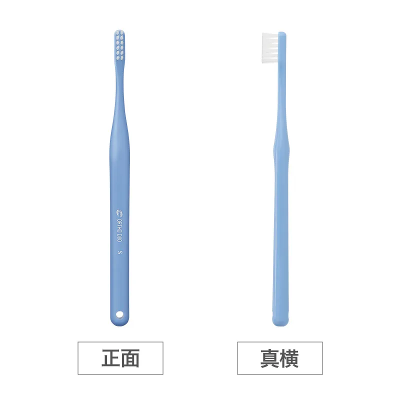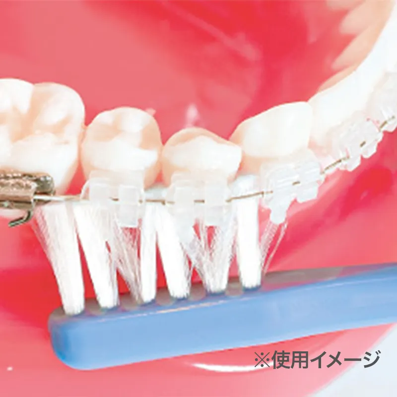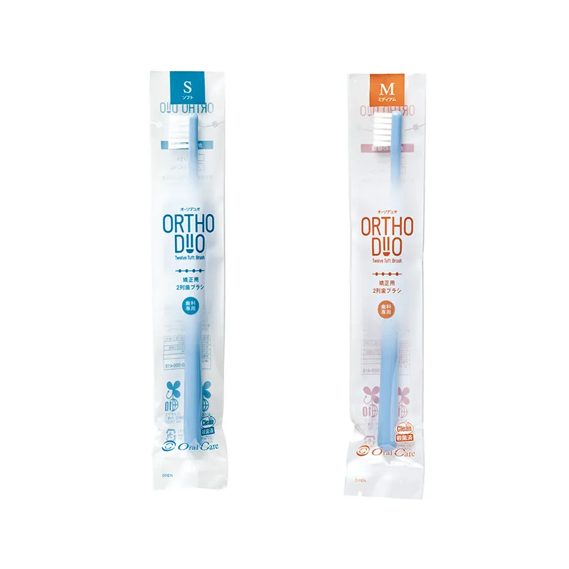 矯正装置のまわりなどにスッと届く、ヘッドがスリムな『オーソデュオ』。寝る前など丁寧にプラークを落としたいときに最適で、患者さんの「もっとキレイにしたい」に応えます。 3列ブラシでは磨き切れない叢生部位や歯頸部、狭い口腔内、頬の緊張が強い方にもオススメです。