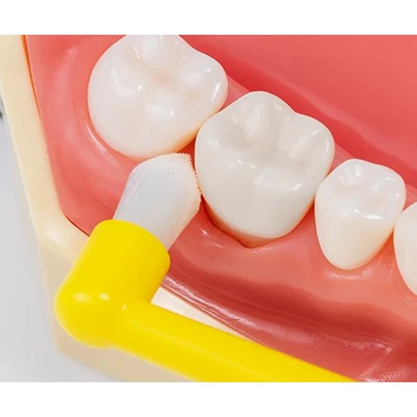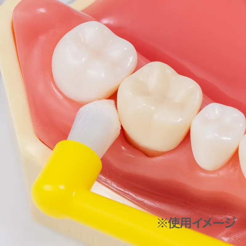 奥歯の裏側、歯と歯の間や歯肉の境目は3列ブラシだけでは落としきれない“リスク部位”。ワンタフトブラシを初めて使う方や苦手な方でも、太めの毛束が狙ったところにしっかり当たって汚れを落とせます。 また、しなる柄がブラッシング圧を適切にコントロールし、歯や歯肉へのダメージを防げるのもポイント。「今までよりもうちょっと丁寧に歯磨きしようかな」と思い始めた患者さんにオススメです。