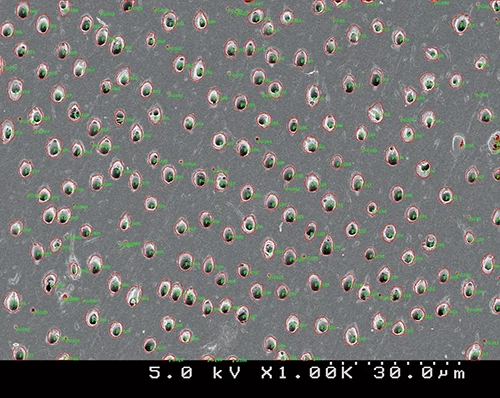 ※試験方法により封鎖率は異なりますSEM図を画像処理ソフト(Image-Pro Plus、Media Cybernetics.Inc)に取り込み、象牙細管の面接と封鎖した部位の面積を算出象牙細管封鎖率(%)=(コントロール面の開孔面積-処理面の開孔面積)/(コントロール面の開孔面積)×100