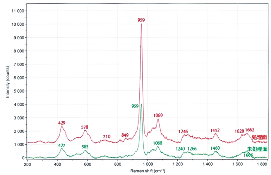 アパシールドによる象牙質の処理効果アパシールド処理面のラマンスペクトルの強度は未処理面より強く、本品由来のハイドロキシアパタイトで封鎖されていることを確認