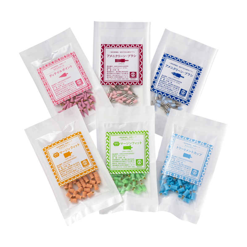 ■PMTCカップ マージンフィット スタンダード(1袋50個入り) 隅角部分にしっかり入り込み、歯肉縁下のバイオフィルムを除去するカップ。日本人の口腔内状況に合わせた絶妙なサイズ感とペーストが飛び散りにくいターボ形状で、クリーニングをスムーズに進めることができます。 ■PMTCカップ マージンフィット スモールロング(1袋50個入り) 細かな部位の歯肉縁下に潜むバイオフィルムを除去できる、細めのカップ。スタンダード同様、施術を円滑にするターボ形状です。叢生部位、矯正装置周辺、乳歯、下顎前歯などのクリーニングがラクになります。 ■トリートメントカップ(1袋50個入り) トリートメントケア専用に開発された、非常に柔らかいカップ。歯面にフィットして、患者さんに心地のいいトリートメントケアを提供できます。 ■ディテイルポイント(1袋50個入り) カップの届かない矯正装置周辺、ブリッジポンティック周囲、インプラント、歯間空隙の広い部位など。クリーニングしたいところにピンポイントで当てられる三角チップです。 ■アメニクリーン・ブラシ フラット(1袋20個入り)/ポイント(1袋20個入り) 強固なバイオフィルムを除去する際に使用。咬合面や歯面のくぼみなどの細かい部分は、『ポイント』を使うとより確実に除去できます。