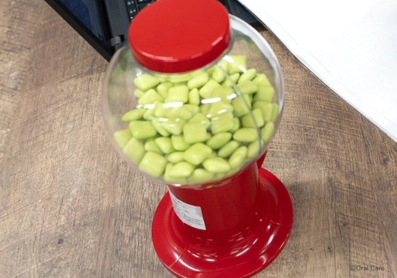 社内のいたるところにキシリトール入りガムのディスペンサーを設置。社員は打ち合わせ中や昼食後など、いつでも好きなタイミングで食べられます。